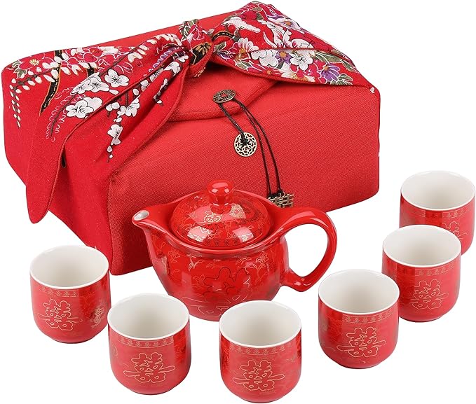 I-MART Chinese Tea Set, Red Ceramic Chinese Wedding Tea Set